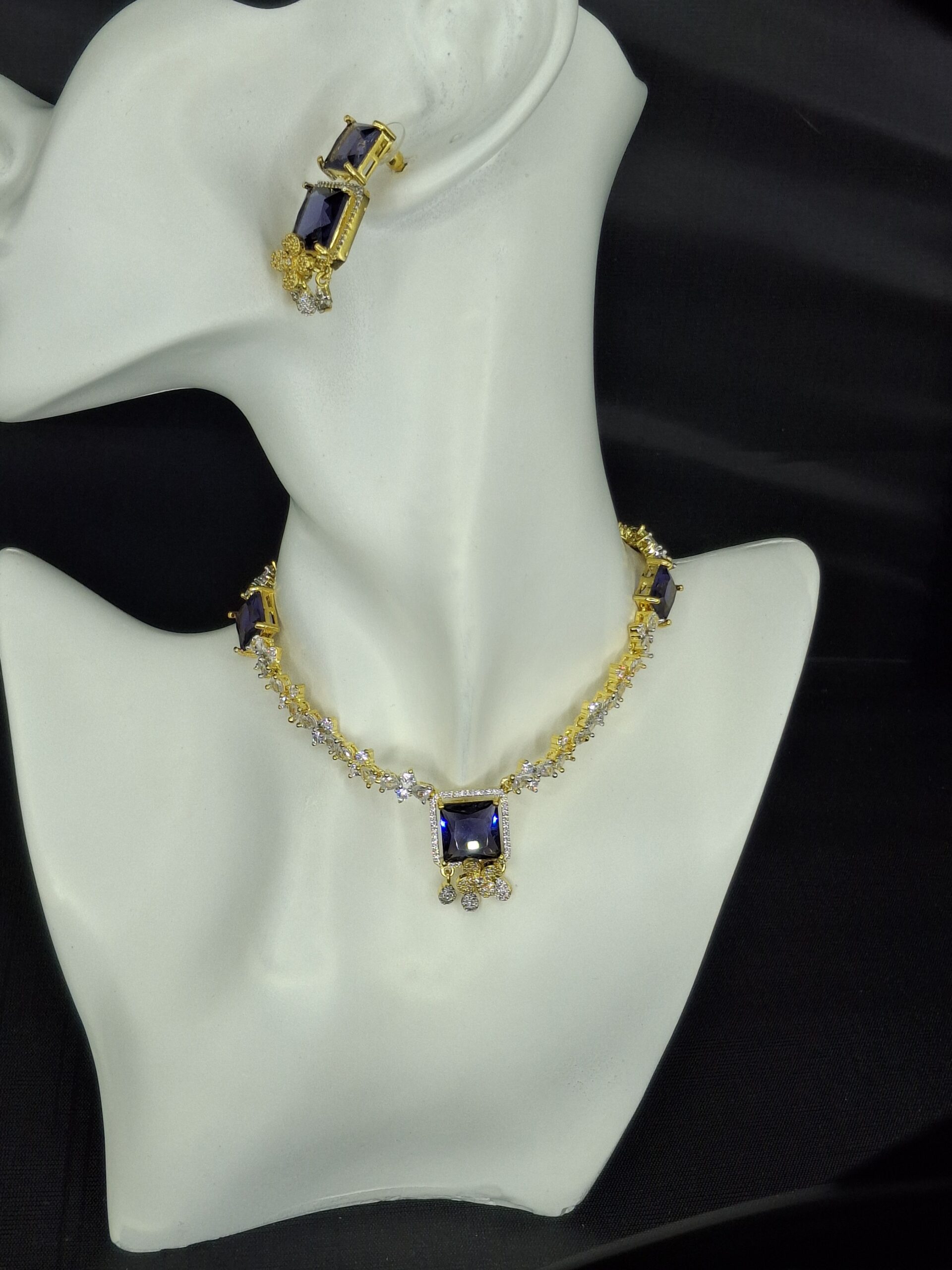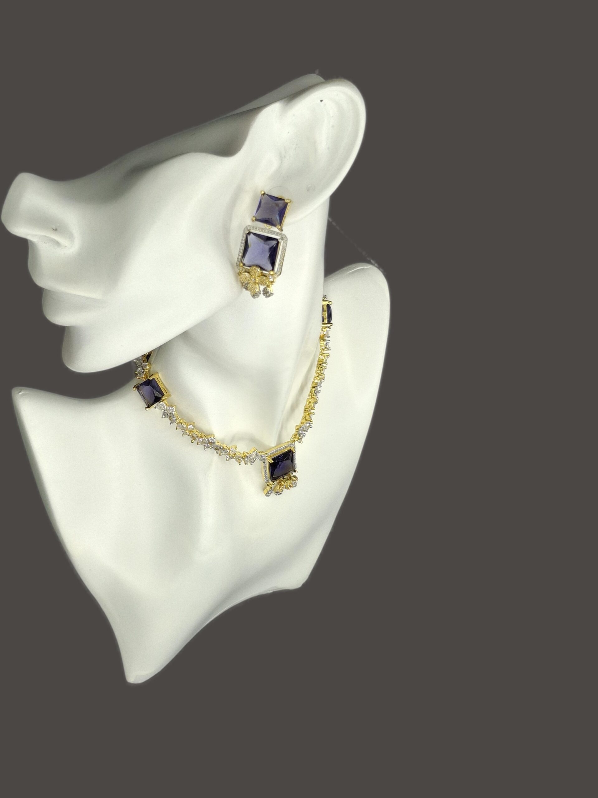 This necklace set is made up of purple coloured AD stones with beautifully carved silver stones on gold polish. It has two top earings.