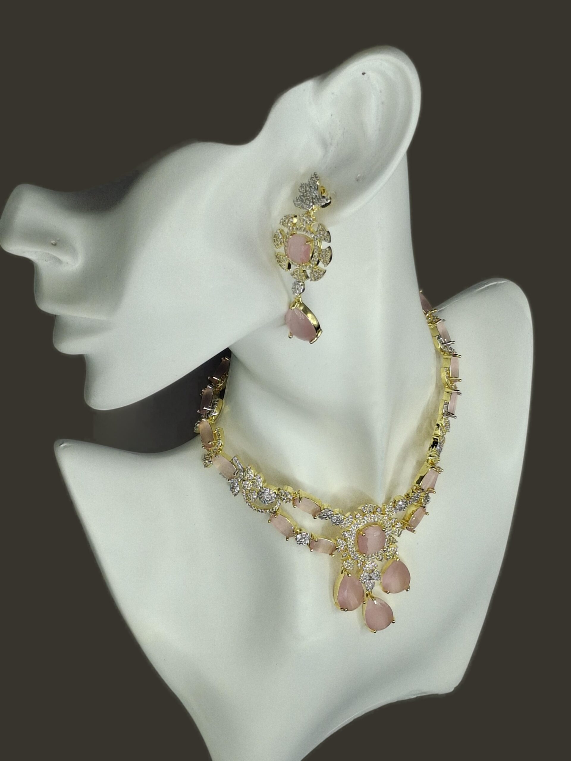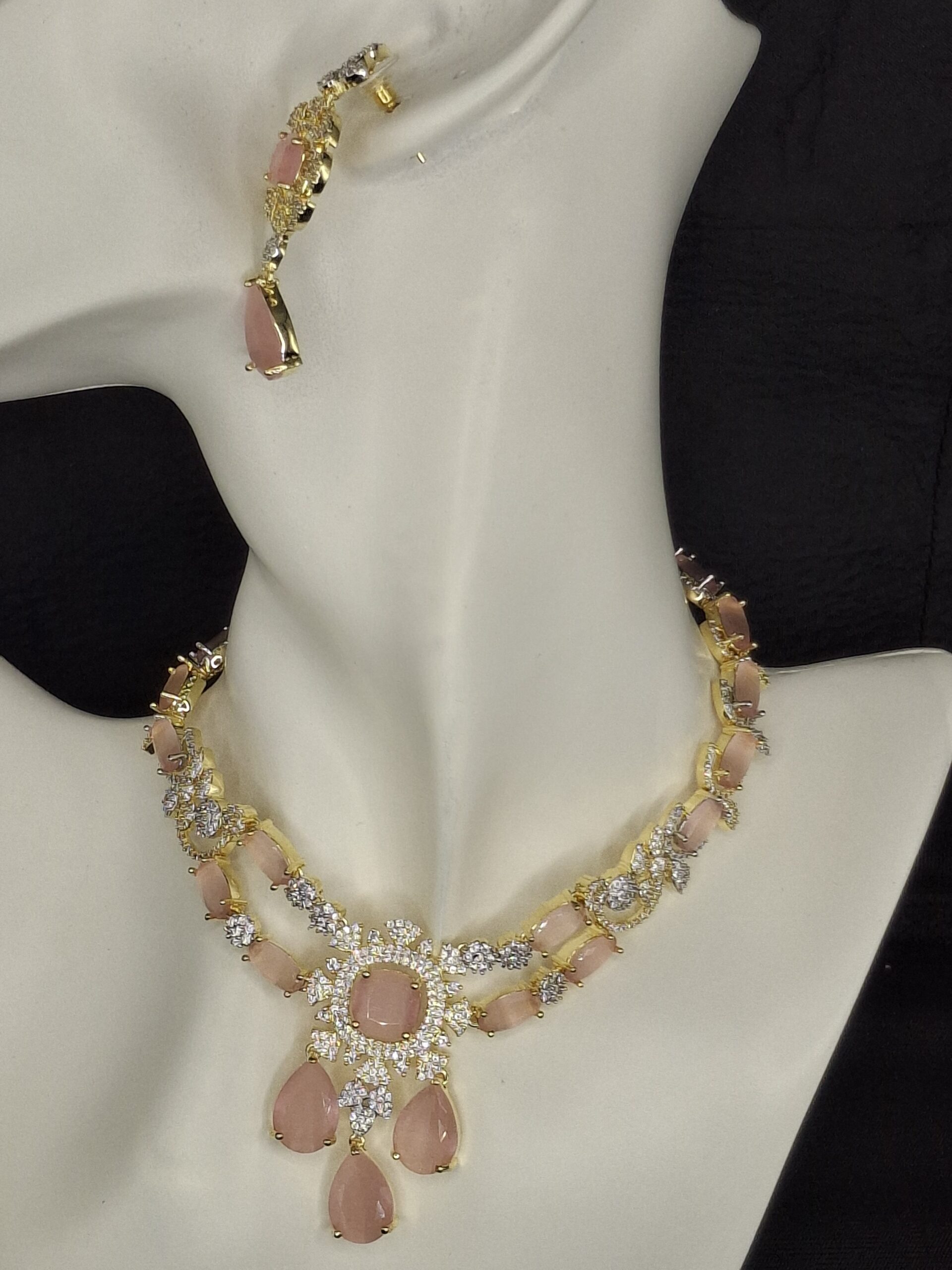 This is a bit of design, the one who wants to match up with sarees and functional dresses. It’s just a perfect gift. It has light pink coloured AD stones on gold polished necklace set.